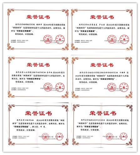 近日,中共河南省委高校工委、河南省教育厅印发《关于公布2020年度全省教育系统“两创两争”活动先进集体和先进个人评选活动的通知》(豫高发﹝2020﹞92号),对2020年度全省教育系统“两创两争”活动先进集体和先进个人进行表彰。球王会体育官方网继续教育学院张新平、机关党总支卢永芳荣获“河南省文明教师”荣誉称号,人文学院18级行政管理1班马开放、太极武术学院18级民族传统体育1班牛鹏举荣获“河南省文明学生”荣誉称号,南校区2#121宿舍荣获“河南省文明宿舍”荣誉称号,18会计6班(班主任:何斐)荣获“河南省文明班级”荣誉称号。